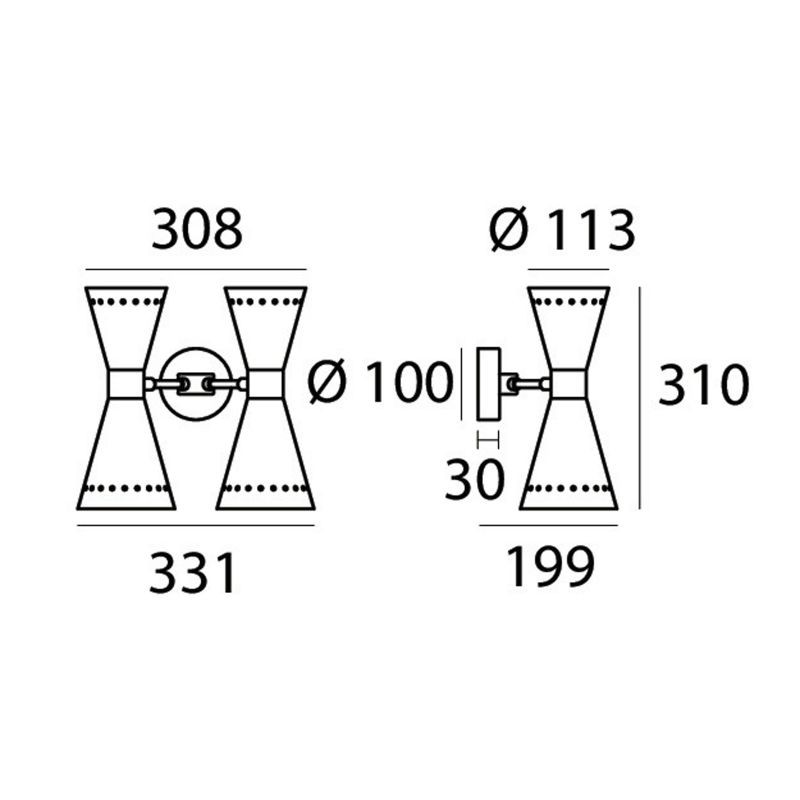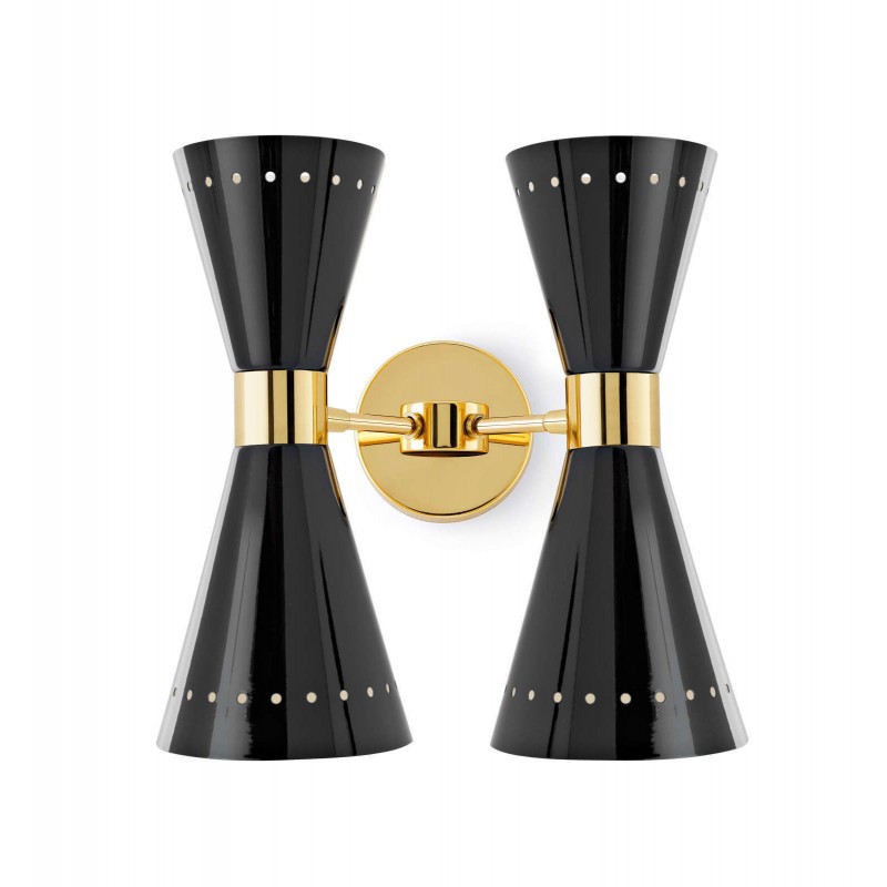 Lampada icona degli anni Cinquanta a luce diretta e indiretta. In versione applique a singolo o doppio braccio, abbina alla preziosa struttura in ottone con doratura galvanica i paralumi conici in finitura avorio o nero lucido, illuminando l'ambiente con eleganza. Corpo in ottone, paralumi in metallo. Finiture: ottone con doratura galvanica, paralumi nero oppure avorio. Fonte luminosa: 4xE14 6W 2700K