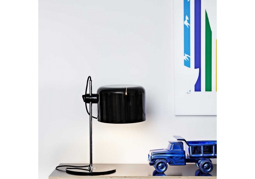 Lampada da tavolo by Joe Colombo nel 1967. Il semplice e ingegnoso meccanismo che collega la tige alla testa permette di orientare il fascio luminoso in diverse direzioni, spostando la calotta in alto, in basso e lateralmente. Luce diretta, base in metallo verniciato, asta cromata; riflettore, orientabile e regolabile, in alluminio verniciato.