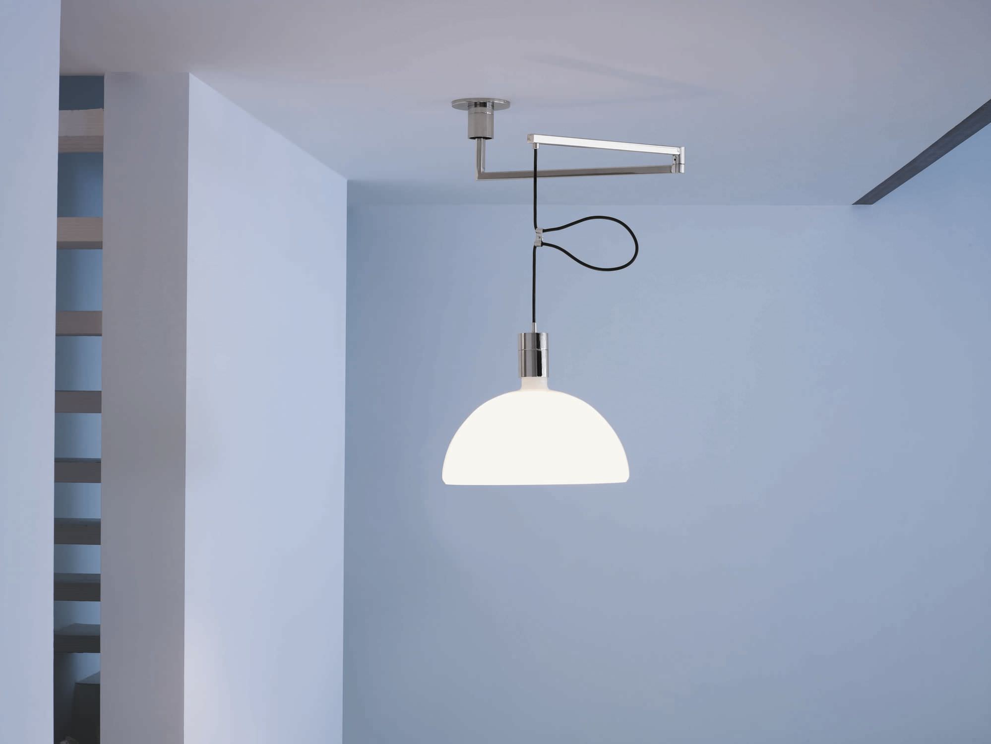 Lampada a sospensione con componenti metallici a vista cromati e paralume a coppa, in vetro bianco opalino. Luce diffusa. Braccio girevole e snodabile cromato, completo di serra cavo per la regolazione della lunghezza del cavo in uscita.