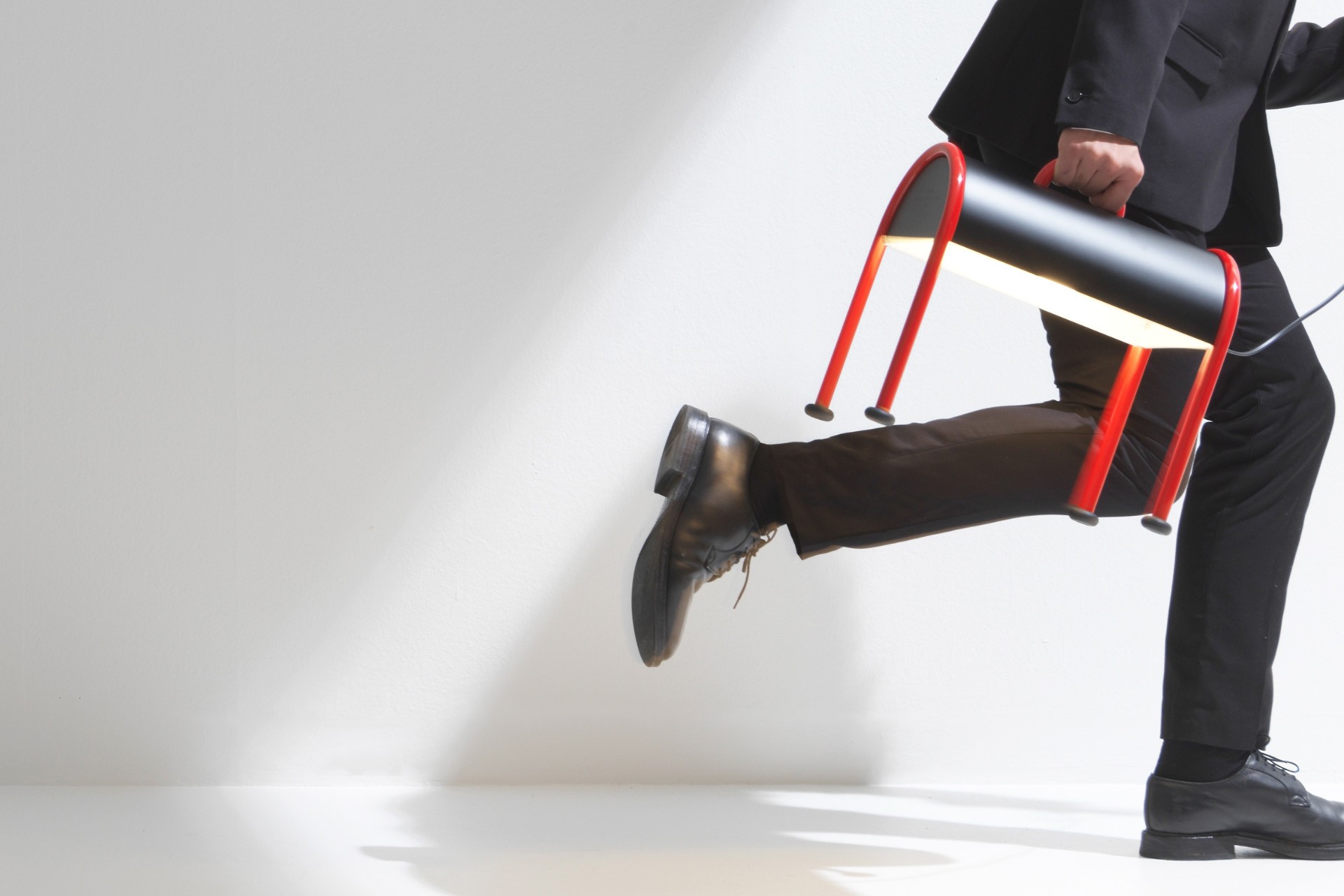 Info e Trattativa Riservata +39 366 1994692 Valigia è ironica e informale: la piccola maniglia e i due archi portanti in tubo rosso sono connessi alla volta in metallo, che contiene la luce.