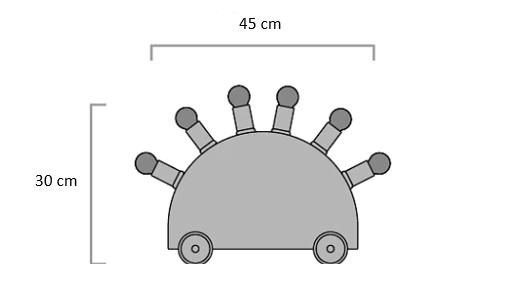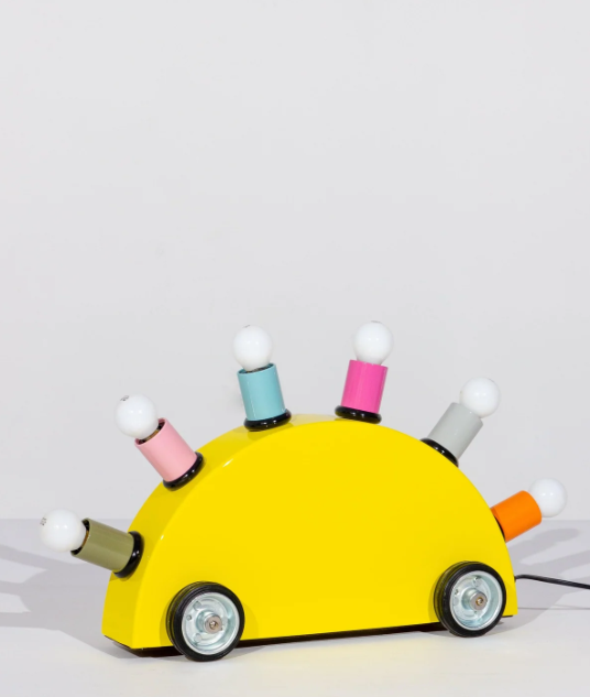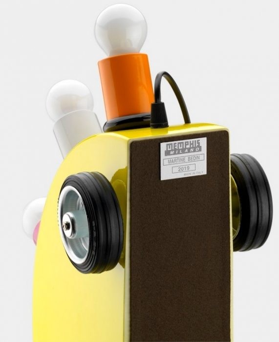Si compone di un semi-cerchio in fibra di vetro appoggiato su quattro ruote di gomma. Il corpo è costituito da sei cilindri colorati in metallo laccato con portalampada. Le lampadine stesse contribuiscono all'estetica della lampada.