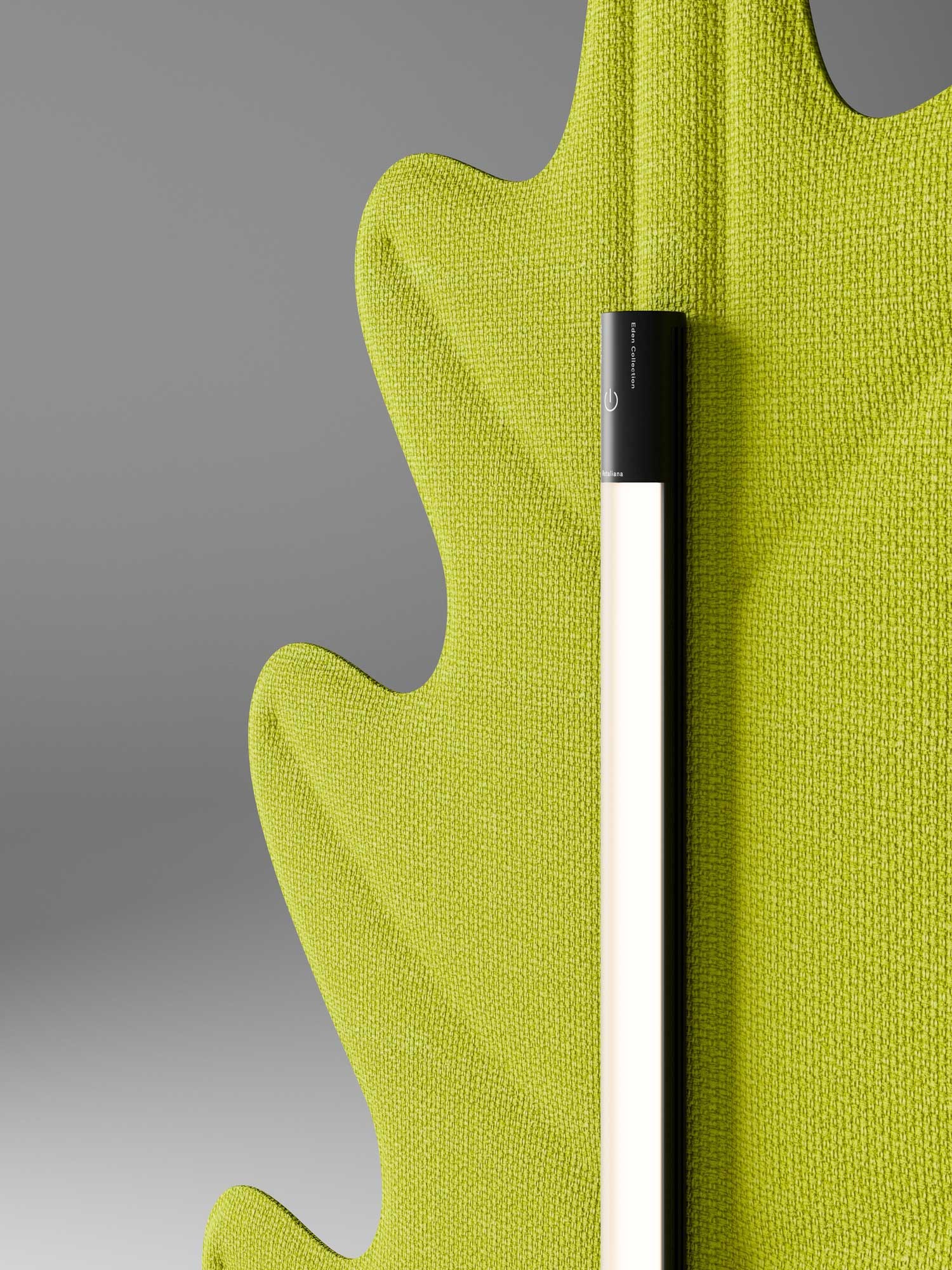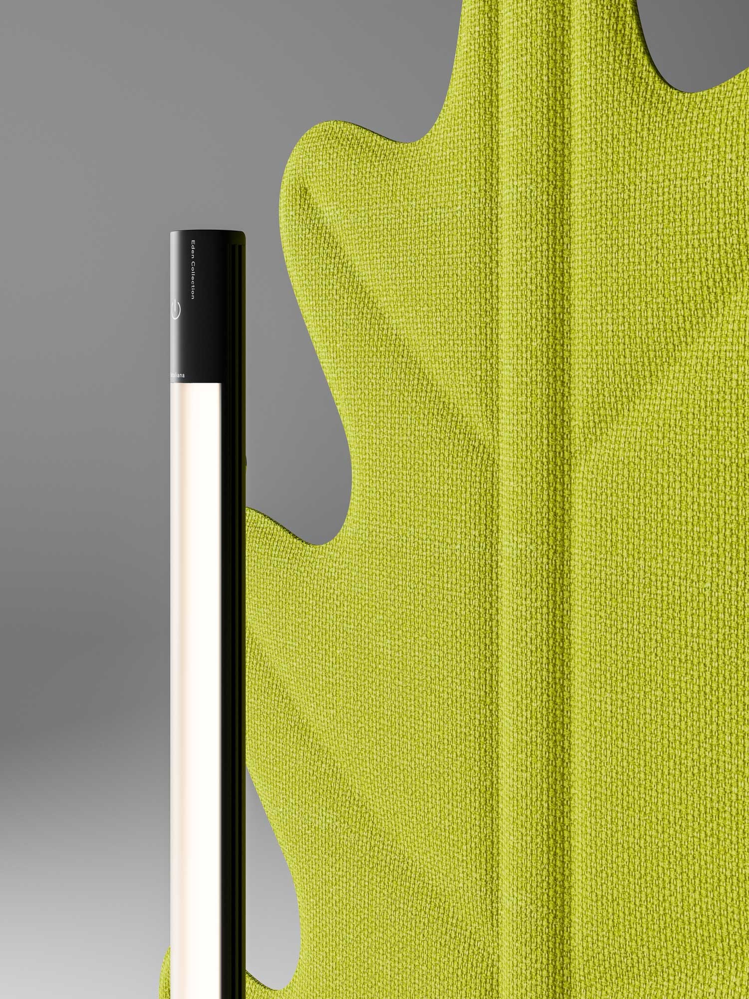 Eden è una famiglia di lampade da terra. Tre grandi foglie fonoassorbenti a cui è applicata magneticamente una lampada a Led. Grazie alla soffice imbottitura e al particolare tessuto di rivestimento, le foglie, oltre a illuminare lo spazio con luce indiretta, contribuiscono a migliorare il comfort acustico. La vivibilità di un ambiente deriva in gran parte da un elemento invisibile e forse, proprio per questo, spesso trascurato: la sua acustica. Riverberi e rumori possono disturbare la conversazione, impedire la concentrazione e il relax, suscitare sensazioni sgradevoli e perfino avere degli effetti nocivi sul benessere psicofisico.