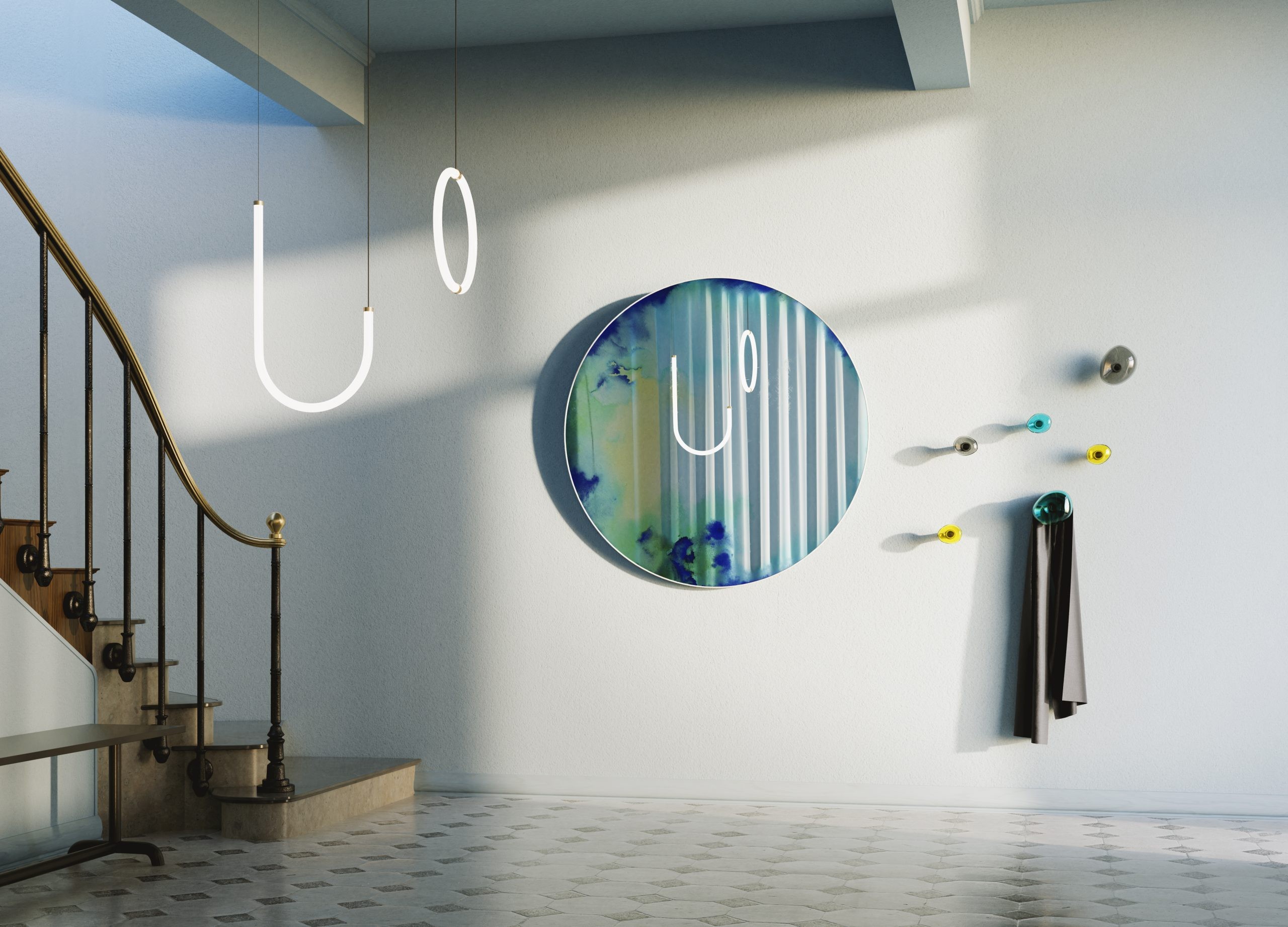 Lo specchio da parete FRANCIS è il risultato di un esperimento con i pigmenti. Il modo in cui i colori scivolano lungo il perimetro evoca l'ossidazione di vecchi specchi o i pigmenti di una tavolozza da trucco.