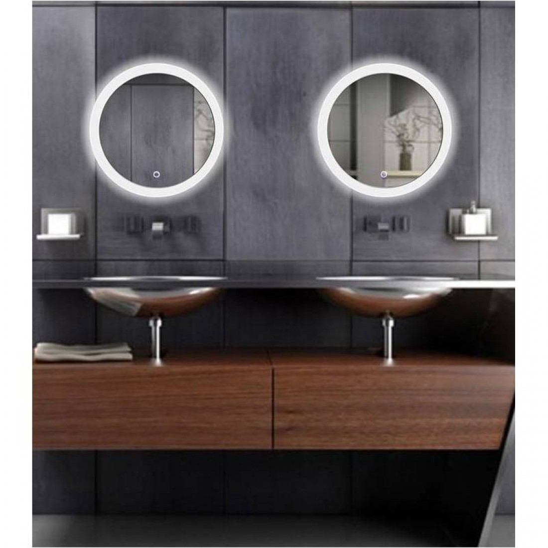 Specchio circolare disponibile in diverse dimensioni; ha un'illuminazione perimetrale che lo descrive.