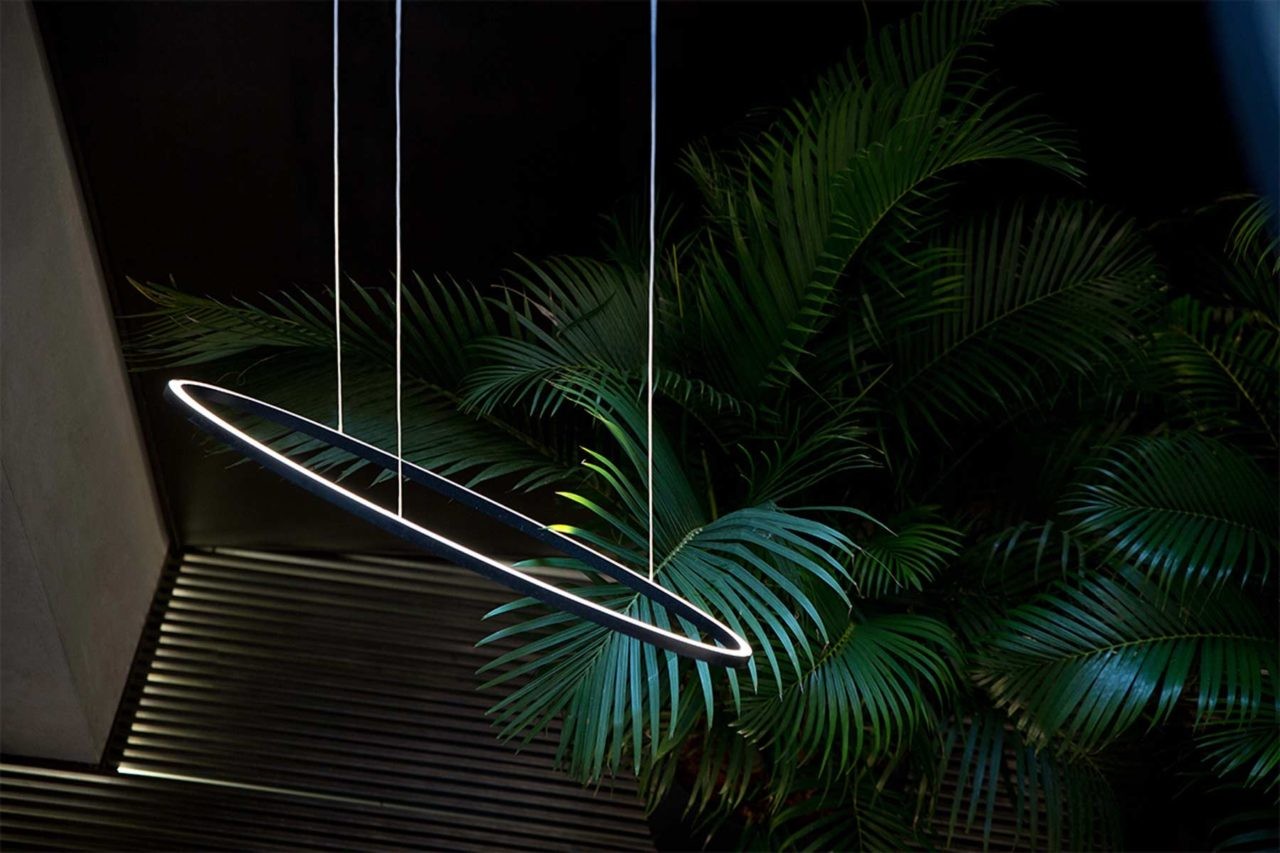 Lampada a sospensione in estruso di alluminio verniciato bianco opaco, nero opaco, alluminio lucidato o oro verniciato. Diffusore in metacrilato opalino. Ellisse è realizzata attraverso una tecnologia ingegnerizzata da Nemo per l’accoppiamento degli estrusi.