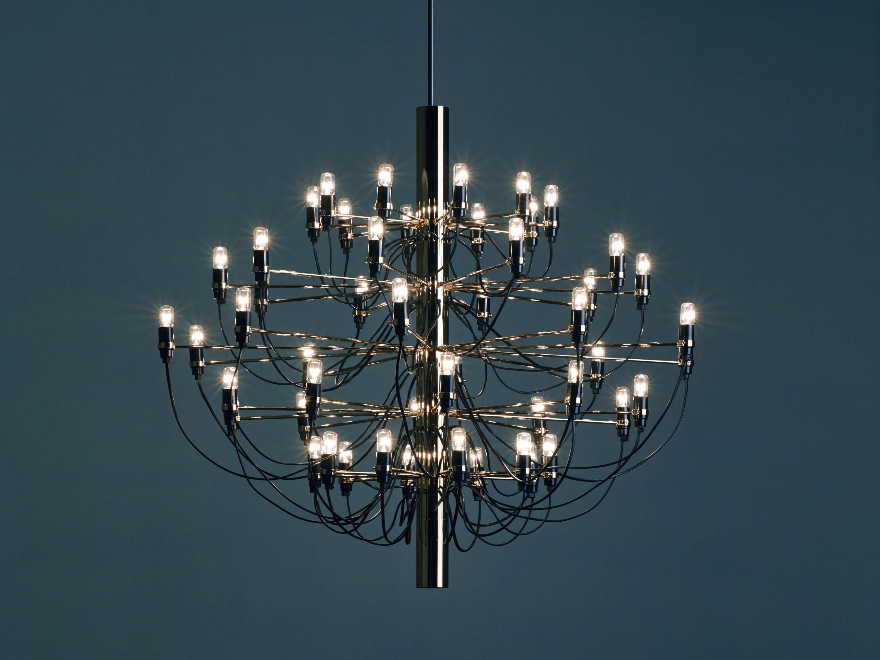 2097/50 è l’iconica lampada a sospensione a luce diffusa firmata Gino Sarfatti, 1958, che rende omaggio ai tradizionali lampadari a bracci ma unendo eleganza e modernità.