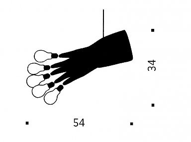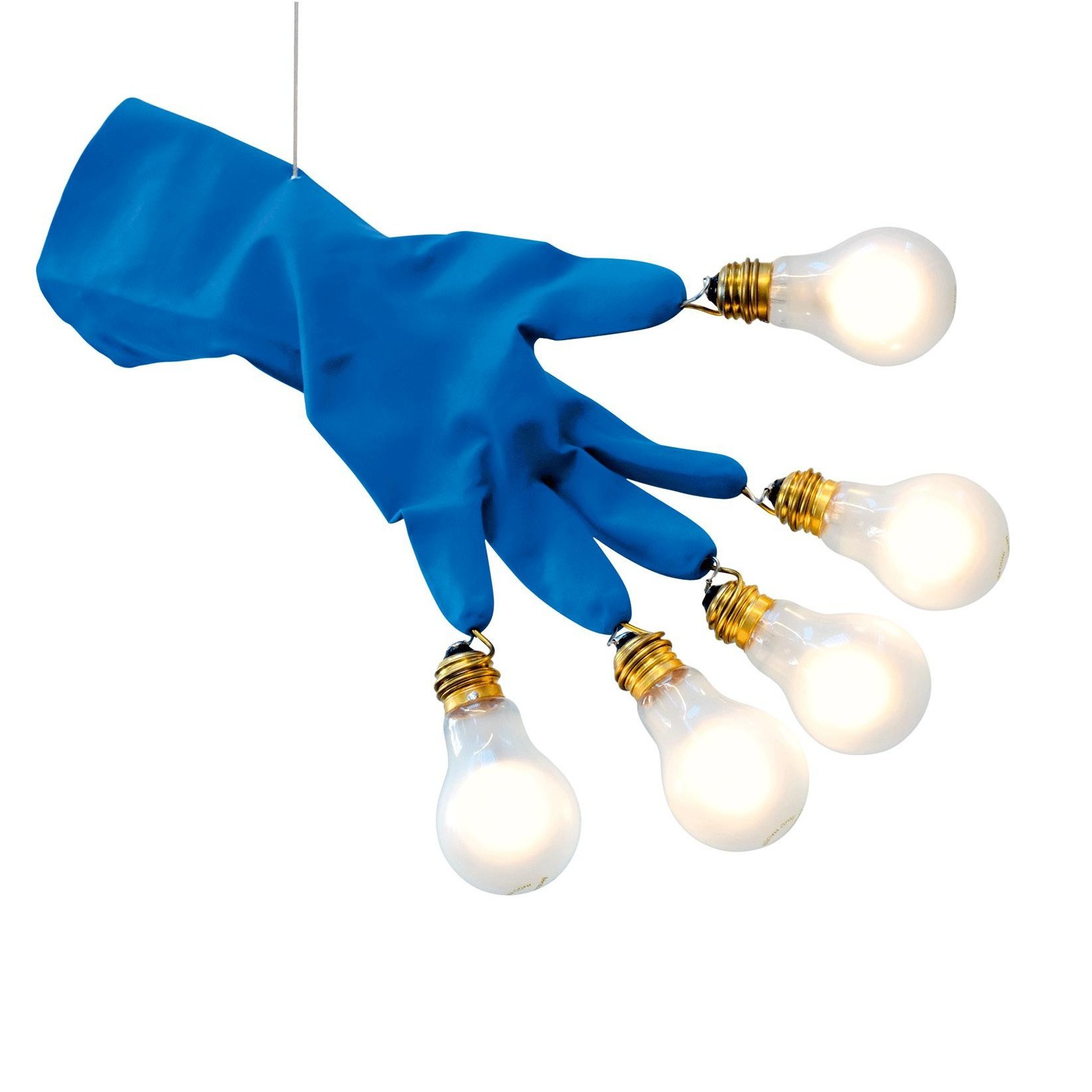 Info e Trattativa Riservata +39 366 1994692 Lampada a sospensione composta da guanti blu con lampadine smerigliate sulle punte delle dita.Fonte luminosa: LED 5X1,5W 650lm 2700K