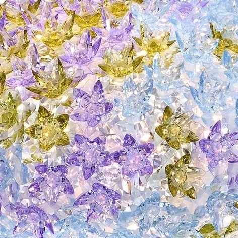 Una lampada prodotta industrialmente, con le forme e la complessità stilistica di un pezzo artigianale. Bloom, progettata da Ferruccio Laviani, è una lampada costituita da una struttura ricoperta da fiori a doppia corolla. Una serie di lampadine posizionate sullo scheletro interno producono luce che attraversa i petali, rifrangendosi sulle loro superfici sfaccettate creando un’infinità di riflessi.