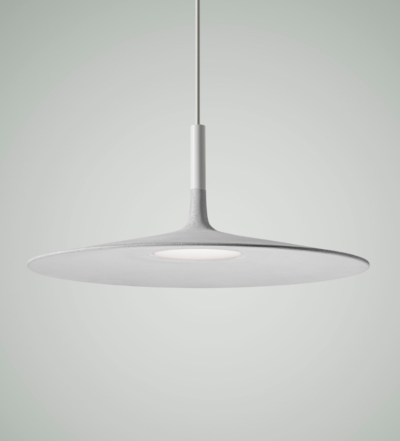 La lampada da sospensione è realizzata in cemento colato a mano, alluminio e policarbonato. Disponibile in bianco, antracite, grigio cemento, marrone.