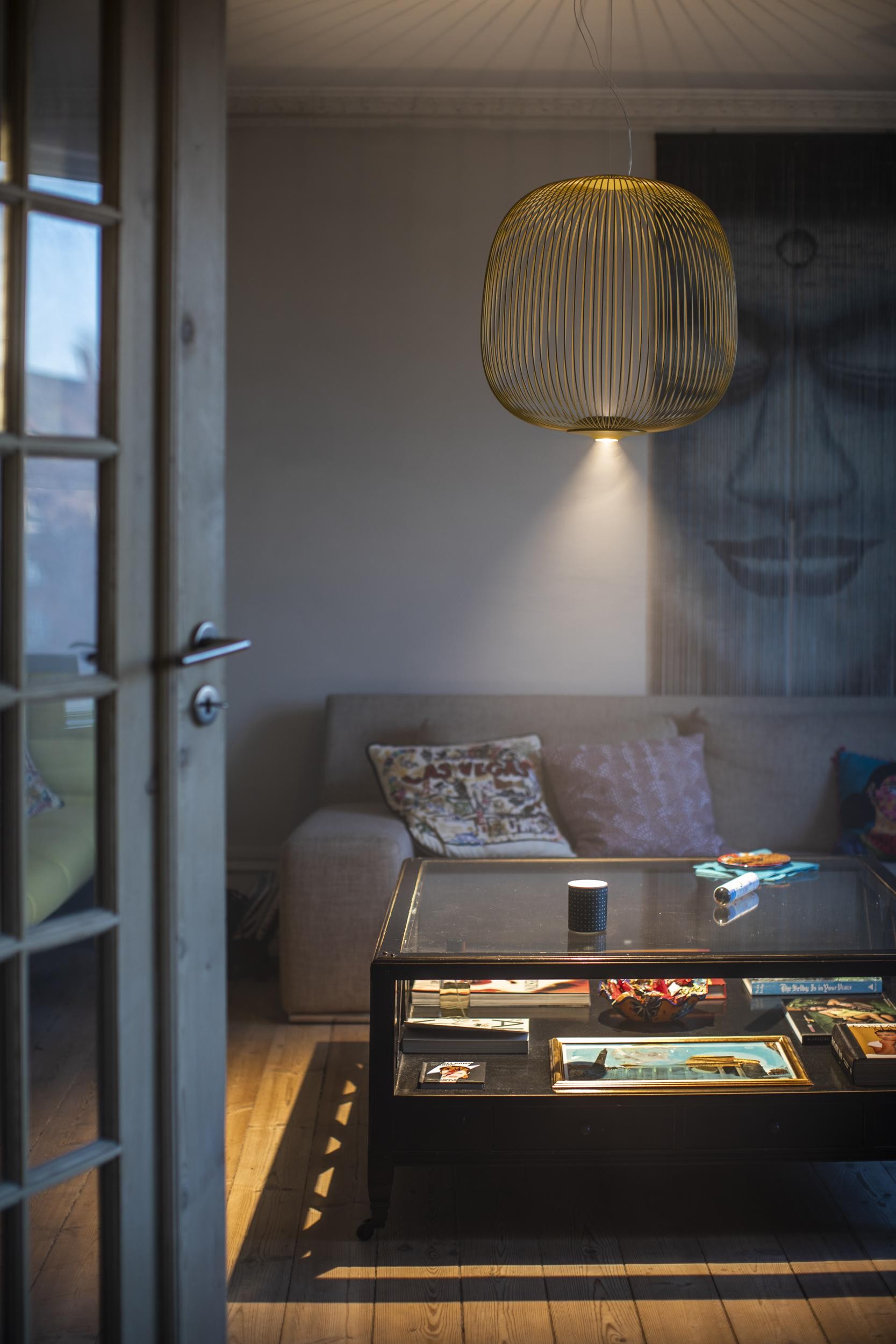 La luce proietta giochi quasi magici sulle pareti e i soffitti, filtrando attraverso il reticolo metallico di Spokes 2. La sospensione a forma di lanterna è disponibile in: bianco, nero, grafite, oro o rame.
