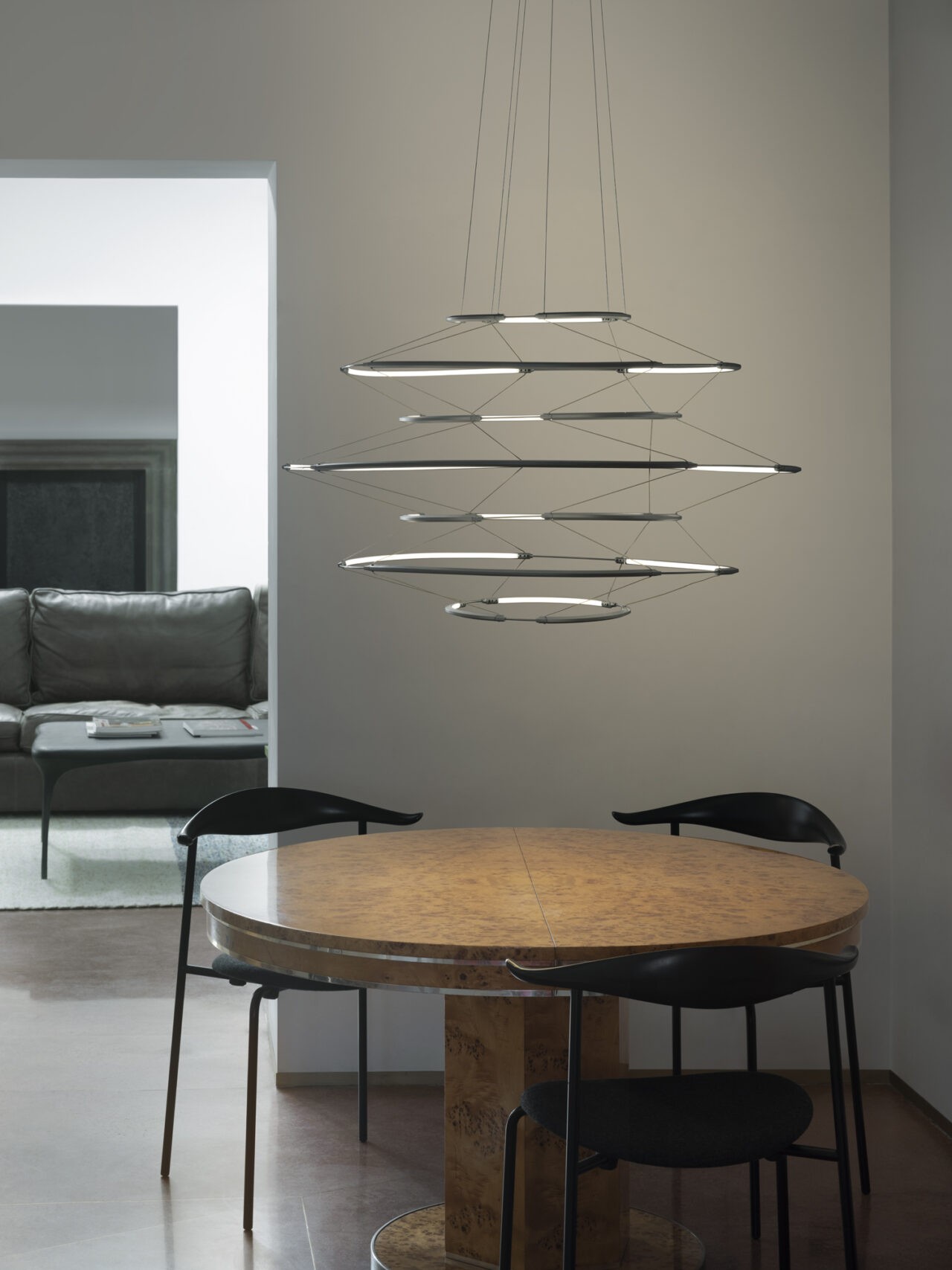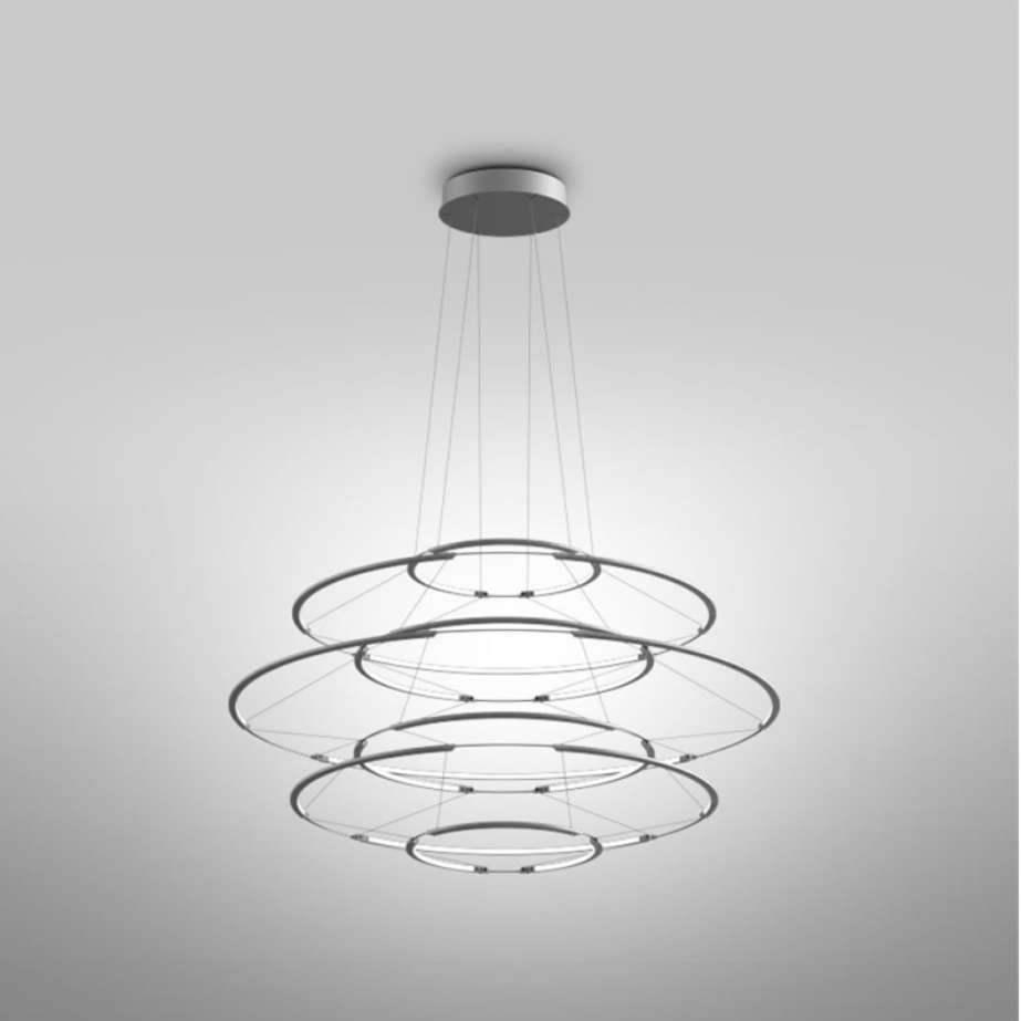 Un lampadario dalle linee chiare abbinato a una struttura in alluminio estremamente sottile per un'eco morbida di luce forte e diffusa.
