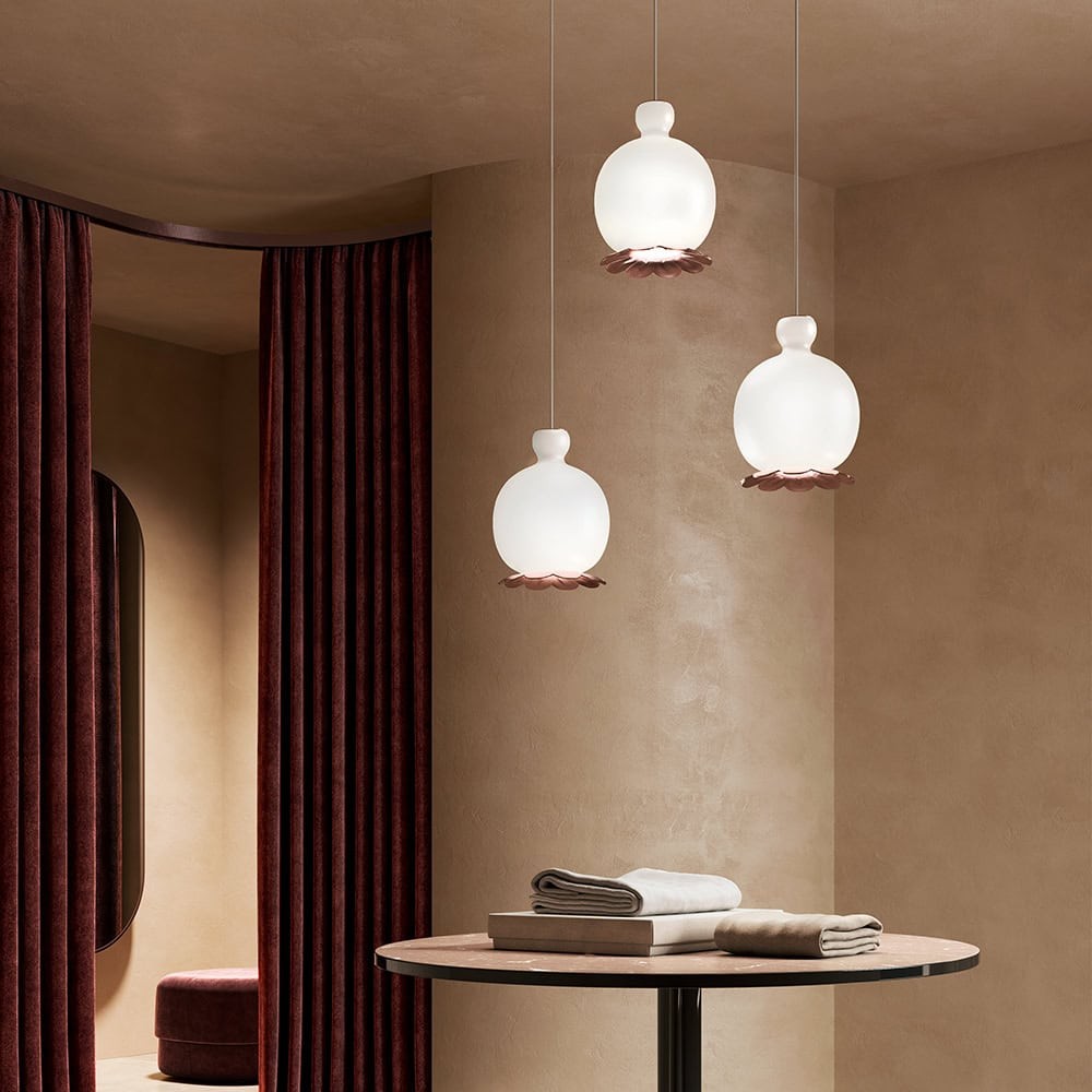 In Opyo si possono intravedere le linee lievi e sinuose del baccello di papavero. La lampada singola o più lampade affiancate fra loro creano atmosfere graziose e eleganti. Lampada da sospensione dimmerabile. Diffusore in vetro opale incamiciato e soffiato.