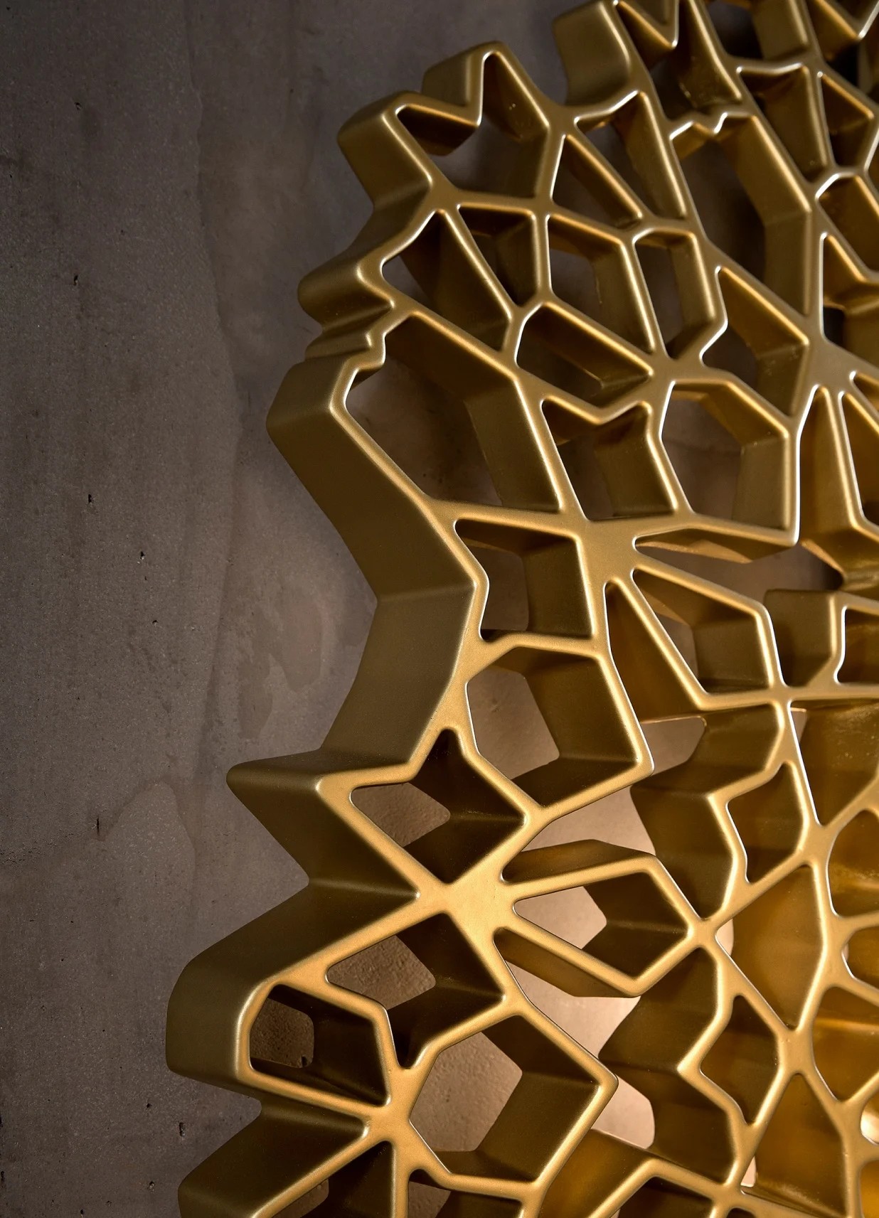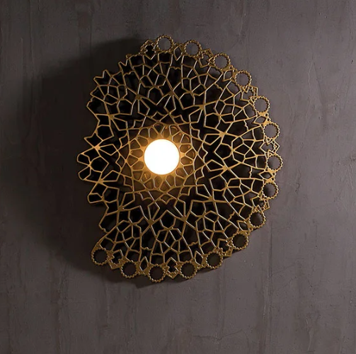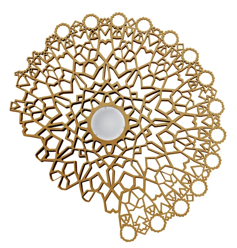 Applique/plafoniera by Luca De Bona e De Meo. Ricorda il fascino principale della luce naturale che si diffonde attraverso i rosoni delle cattedrali gotiche. In Notredame coesistono presente e futuro, così come forma e illuminazione: il suo aspetto poetico nasconde un'anima tecnologica che suscita emozioni molto antiche. Notredame si tinge di oro in modo che possa anche recitare negli ambienti più eleganti e sofisticati. La nuova tonalità, con i suoi riflessi metallici, enfatizza gli effetti della luce tra gli spazi pieni e vuoti della sua trama tridimensionale. Materiali in tecnopolimero, coloro bianco.
