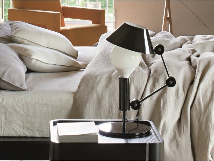 Lampada da tavolo dal braccio snodato e corpo in metallo nero opaco, paralume bicolore con interno bianco opaco, per una luce diffusa, con la possibilità di diminuire l’illuminazione nella parte superiore grazie alla copertura del cappello. Colore Nero Fonte luminosa; 42W E27 Ø12cm bulb 230V