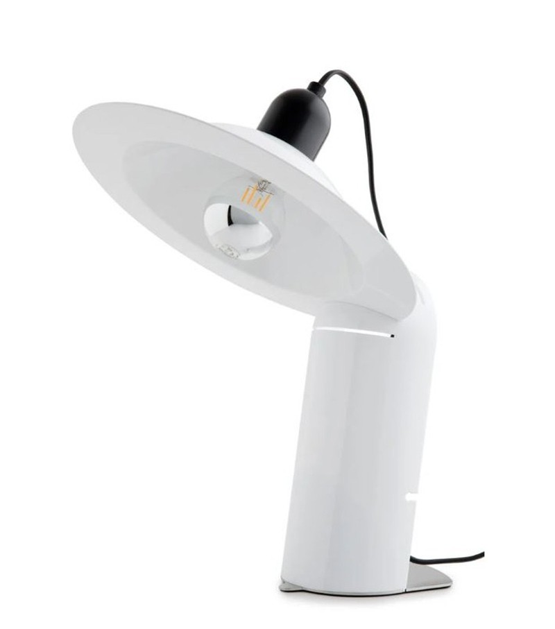 Lampiatta è facilmente riposizionabile senza l’uso di snodi o meccanismi: il paralume è pensato per potersi inserire a piacere in una delle quattro fessure del basamento, consentendo l’inclinazione e l’orientamento della luce. Disegnato da DDL (Jonathan De Pas, Donato D’Urbino, Paolo Lomazzi), 1971 Materiali: corpo in policarbonato in pasta lucido, base d’appoggio in metallo e removibile (per installazione a parete), parabola in alluminio verniciato bianco Colori disponibili: bianco, nero, rosso Fonte luminosa: lampadina LED 7W 2700K E27 cupola argentata inclusa