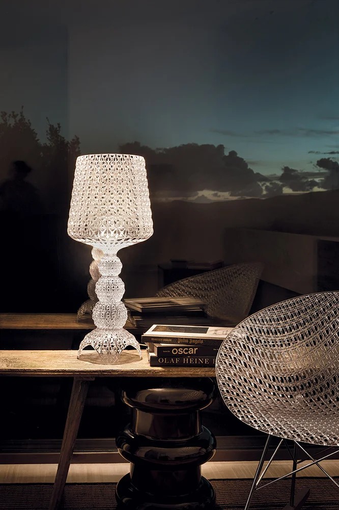 Versione mini della lampada a piantana Kabuki, realizzata ad iniezione che consente di avere una struttura a trama che riproduce il pizzo con una particolare superficie traforata da cui si diffonde la luce. Disponibile in (trasparenti) Cristallo, Azzurro, (opachi) Bianco e Nero, beige e bordeaux