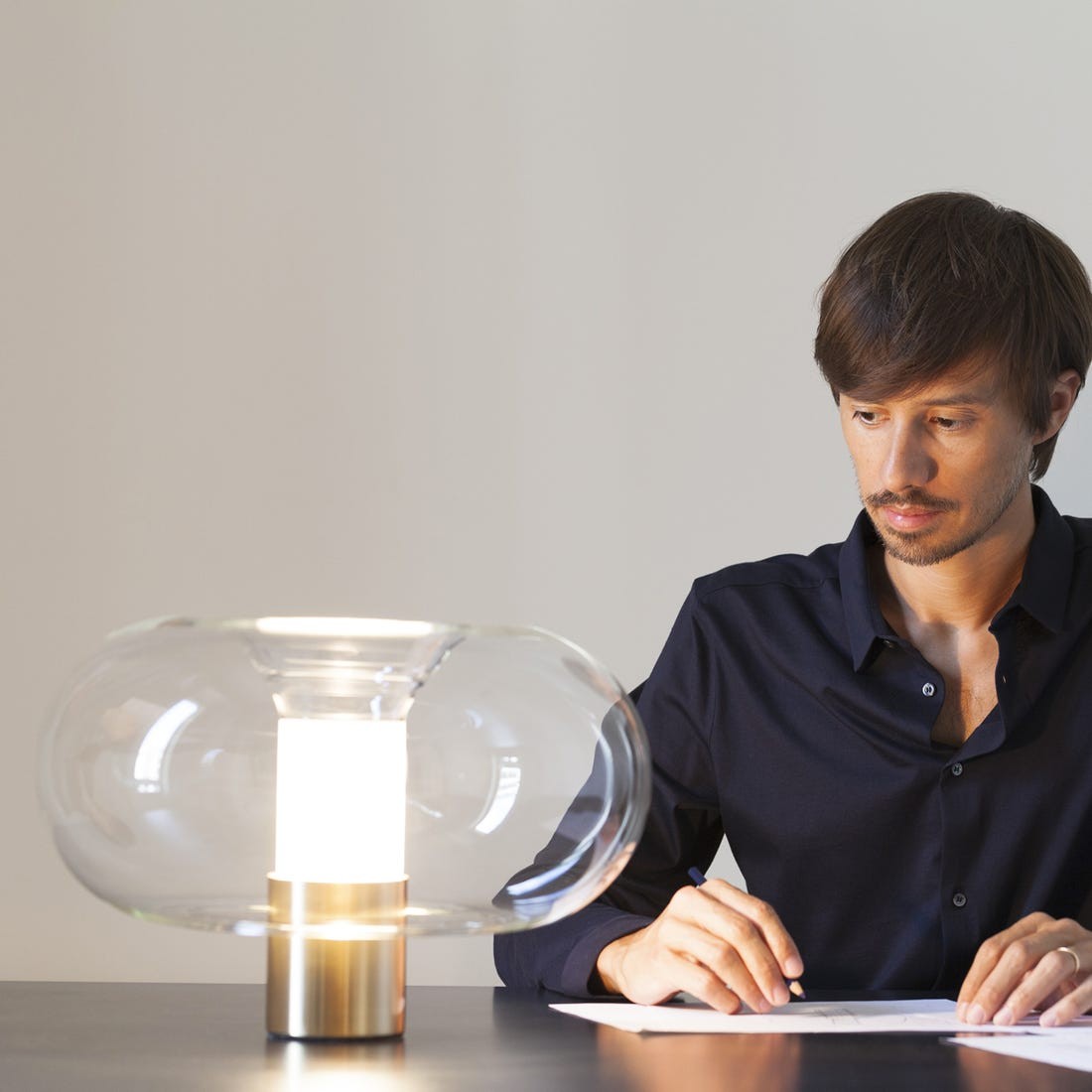 Lampada da tavolo in vetro e metallo. Disponibile in nero lucido e ottone lucido.