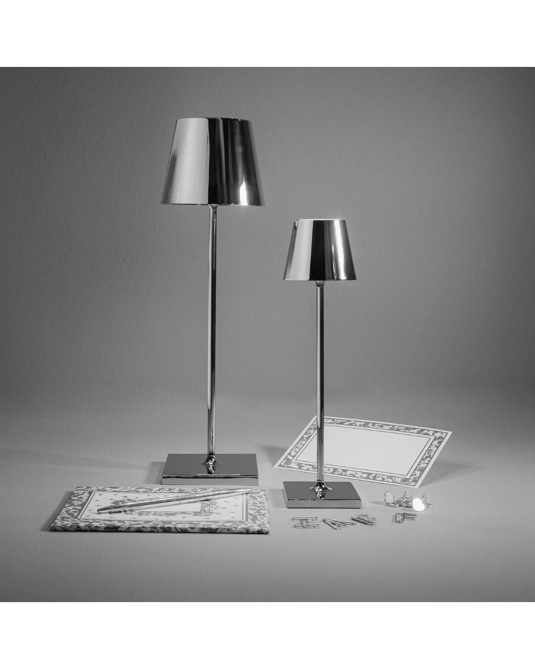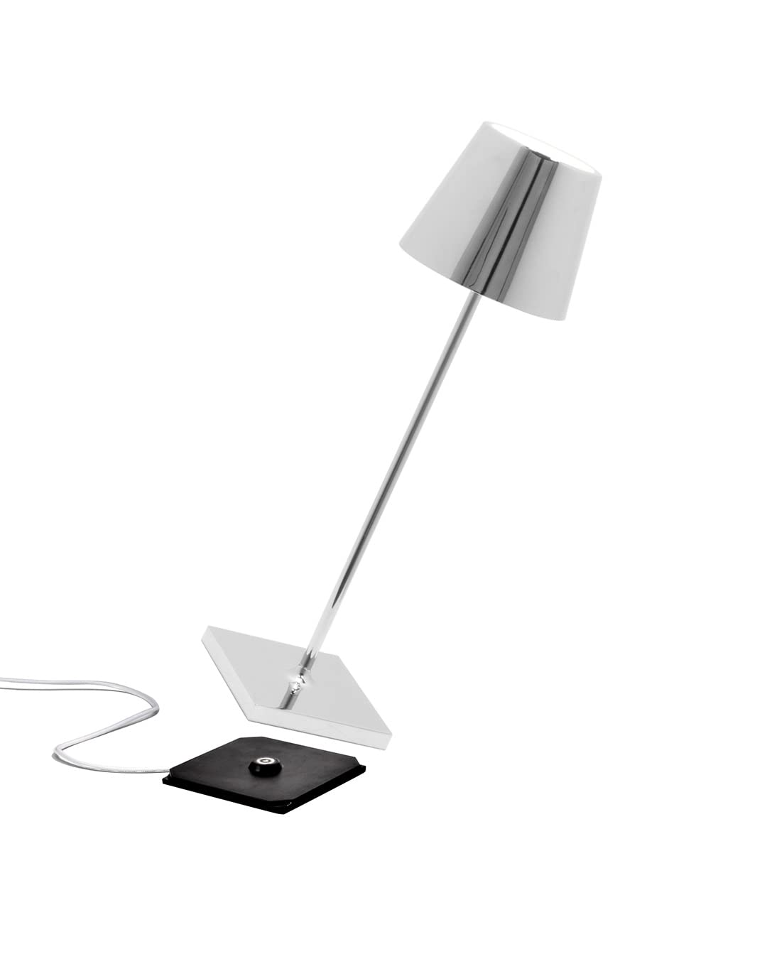 Lampada ricaricabile da tavolo, con corpo in alluminio verniciato.