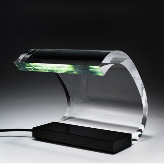 Grazie alla proprietà della conduzione, al materiale spesso e alla sua forma, la luce di una lampadina contenuta all’interno della base, risalga lungo il corpo trasparente arrivando ad illuminare la testa.