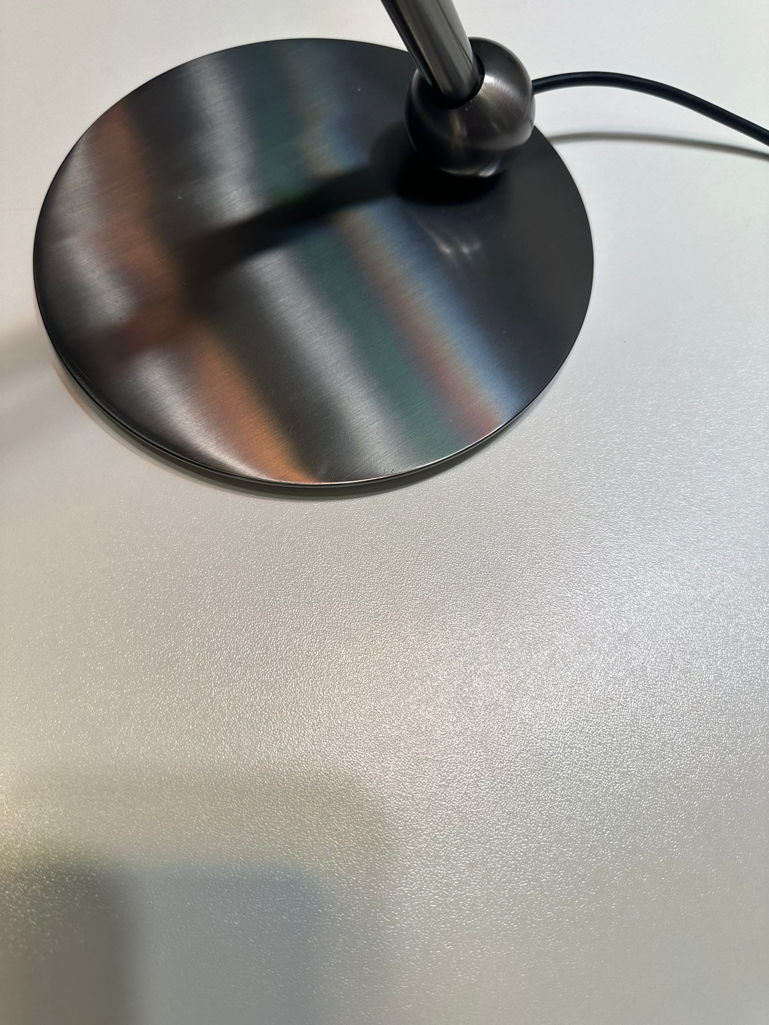 La lampada è composta da due sottili steli a cilindrici, collegati tra loro tramite un perno; il tutto adagiato su un basamento circolare, consentendogli un’ampia rotazione.
