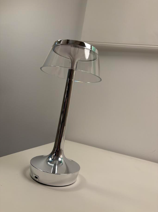 Lampada ricaricabile disegnata dall'architetto Philippe Stark nel 2015; portatile con emissione di luce diretta. Articolo esposto in negozio Bon jour unplugged + crown trasparente.
