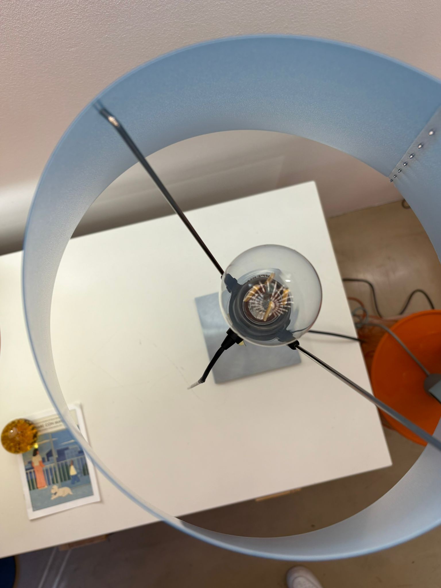 Il paralume di policarbonato appoggia alla struttura di alluminio su due soli punti d’equilibrio. Se urtato, oscilla senza cadere.