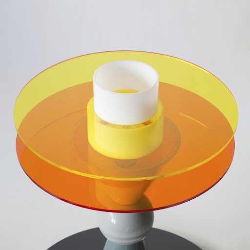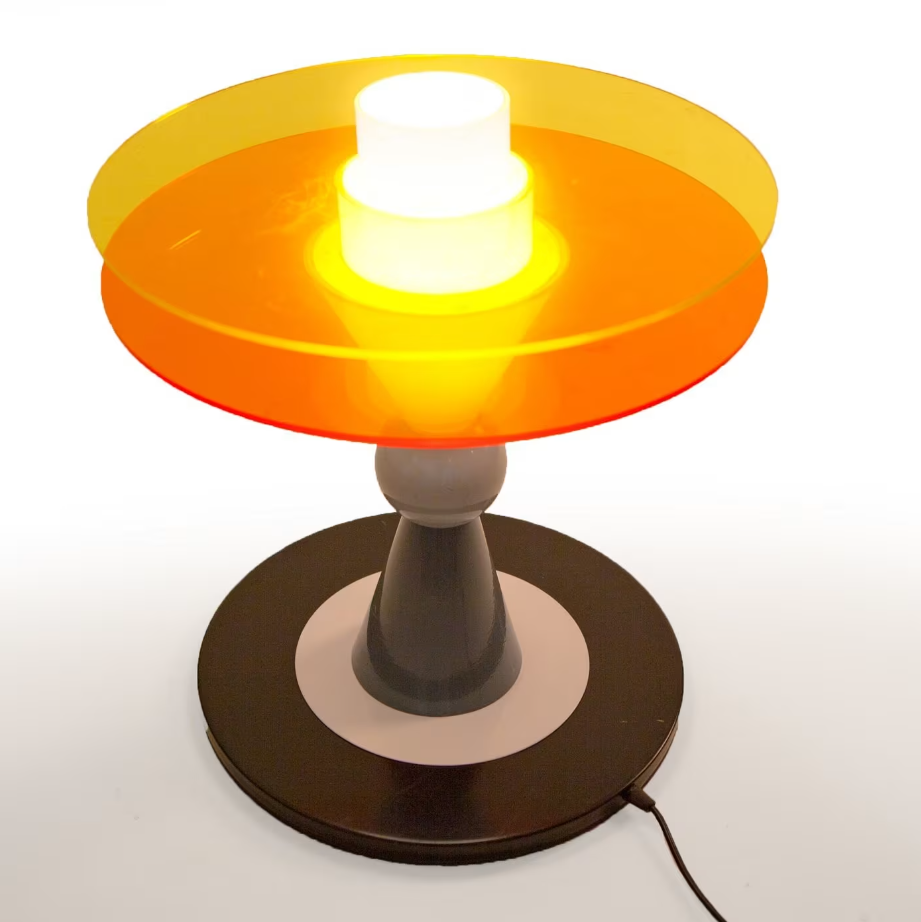 La lampada Bay si impone con personalità: la luce si diffonde creando nell'ambiente un'atmosfera calda e allo stesso tempo enfatizza il colore acceso dei dischi. Come in un gioco illusionistico, i due dischi arancioni sembrano sospesi sulle geometrie del cono rovesciato della base innestato sul corpo illuminante.