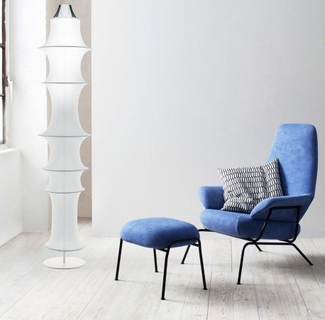 Disegnata dal fantastico Bruno Munari, che ha pensato di dare una forma spontanea alla lampada, generata unicamente dalla tensione delle forze interne a Falkland. Sette anelli di metallo di grandezze diverse, un tubo di filanca, una sola E27 e un riflettore in alluminio che asseconda la forma delle curve del tessuto.