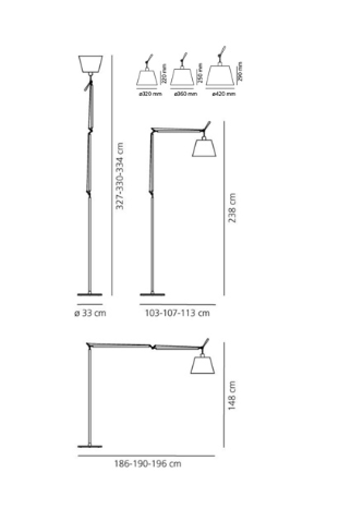 Tolomeo Mega utilizza diffusori diversi sulla stessa struttura a bracci d’alluminio caratteristica di una classica Tolomeo; la struttura da terra ne aumenta l'altezza.
