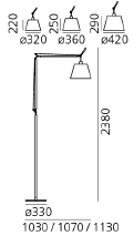 Tolomeo Mega utilizza diffusori diversi sulla stessa struttura a bracci d’alluminio caratteristica di una classica Tolomeo; la struttura da terra ne aumenta l'altezza.