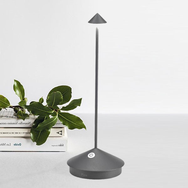 Pina pro è una lampada ricaricabile da tavolo, compresa di base di ricarica a contatto, con corpo in alluminio verniciato, diffusore in policarbonato e fonte luminosa a LED. È dotata di touch dimmer e possiede un grado di protezione IP54 che la rende adatta sia all’uso interno che esterno.