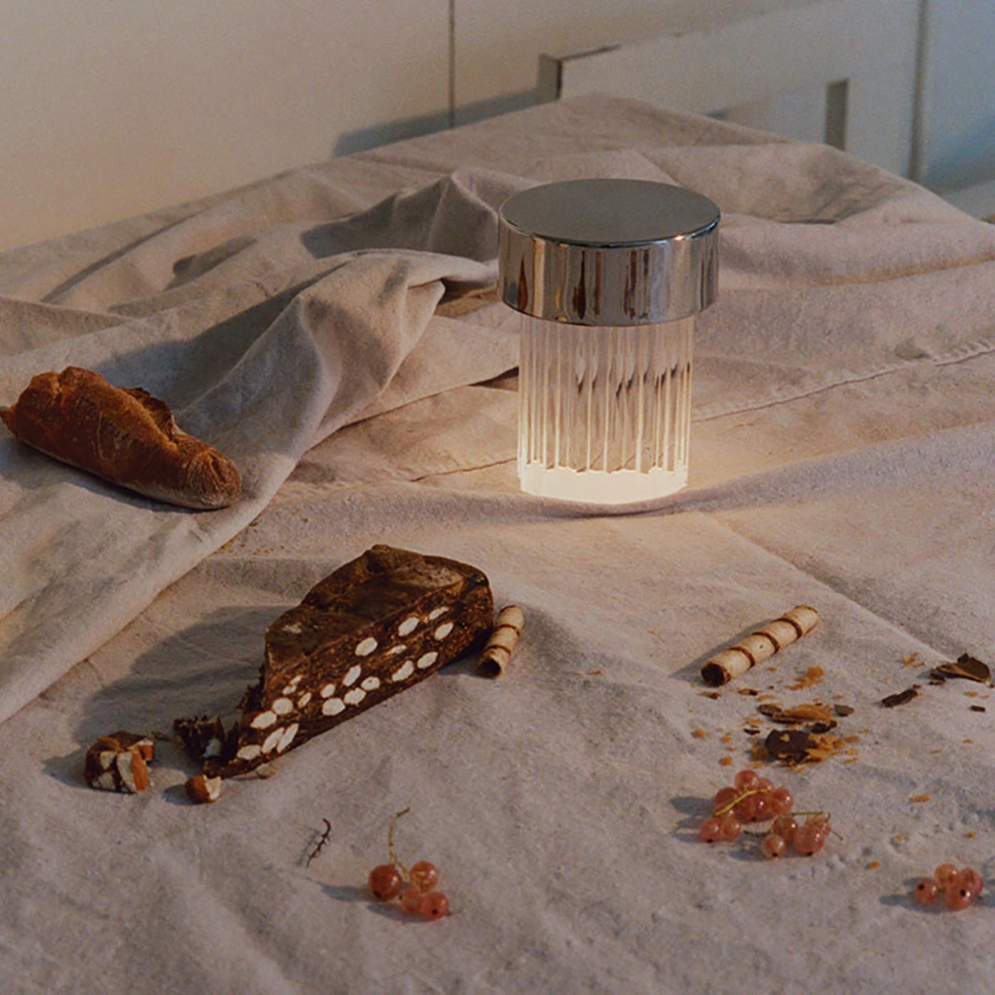 La lampada da tavolo ricaricabile diffonde la luce attraverso una base in cristallo massiccio trasparente, la cui forma fa riferimento alla tipologia architettonica delle colonne antiche. Disponibile in  ottone lucido, rame satinato, verde opaco, acciaio lucido.