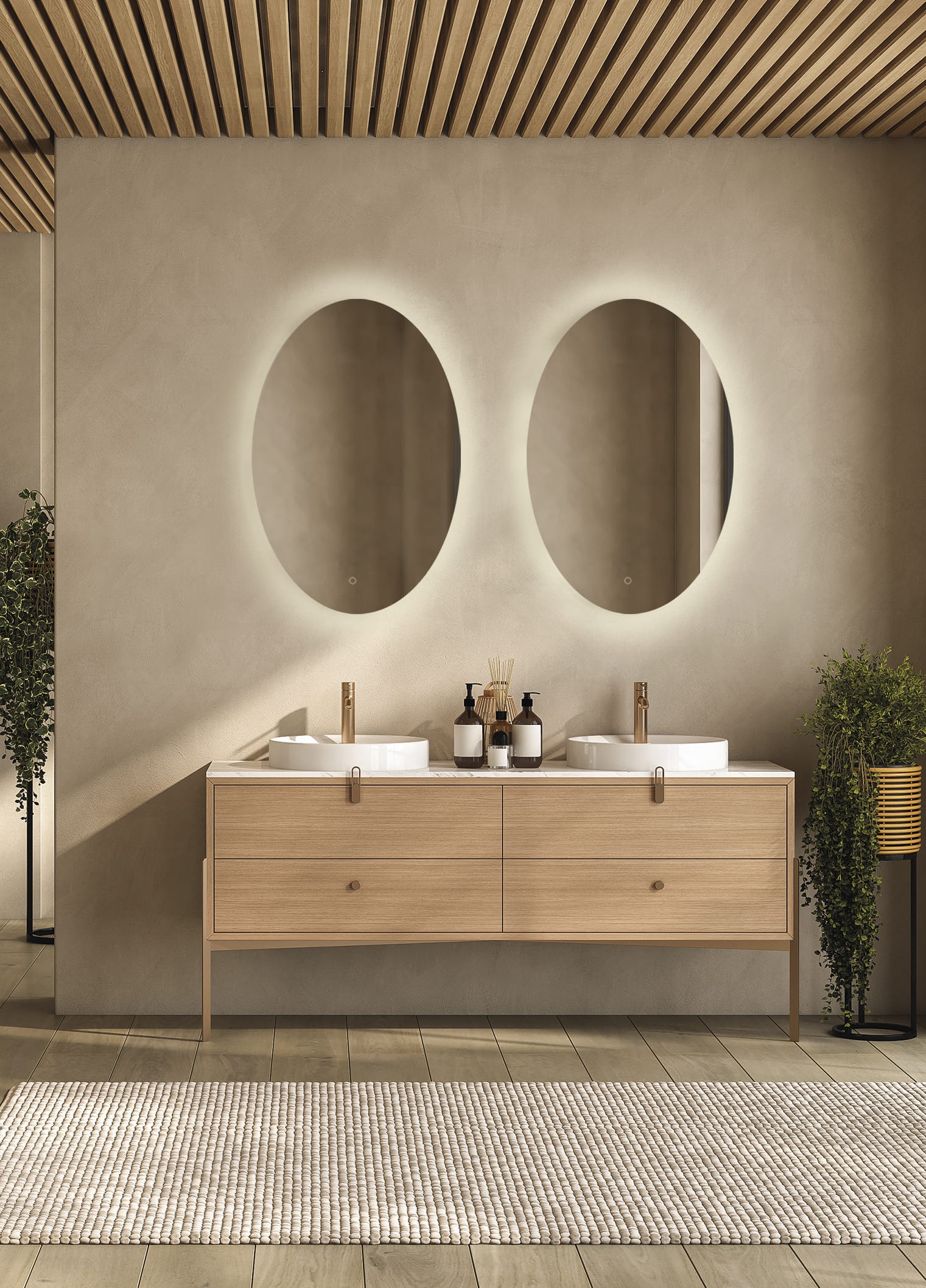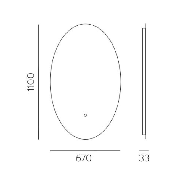 Specchio retroilluminato dalla forma ovale, permette di essere acceso e spento grazie a un pulsante touch all'estremità inferiore dello specchio.