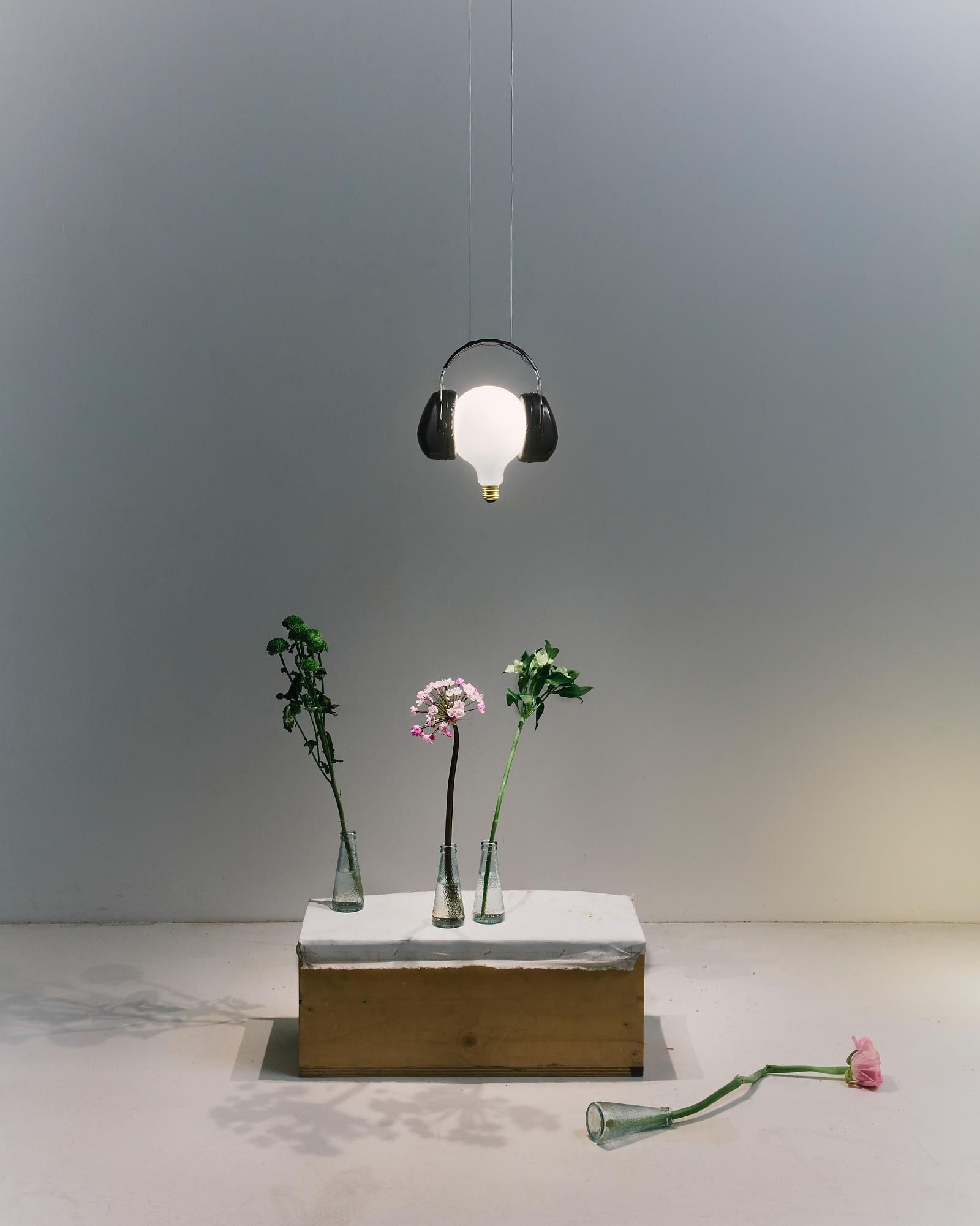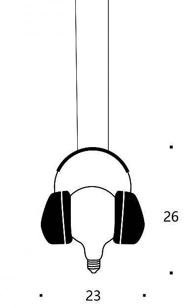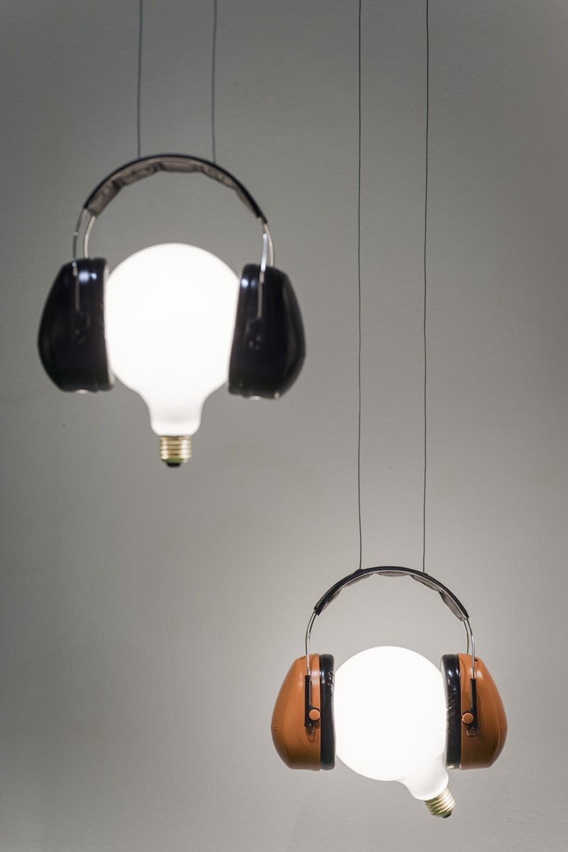 Una lampadina classica, avvolta da cuffie quasi caricaturali – come se volesse sfuggire al rumore del mondo.