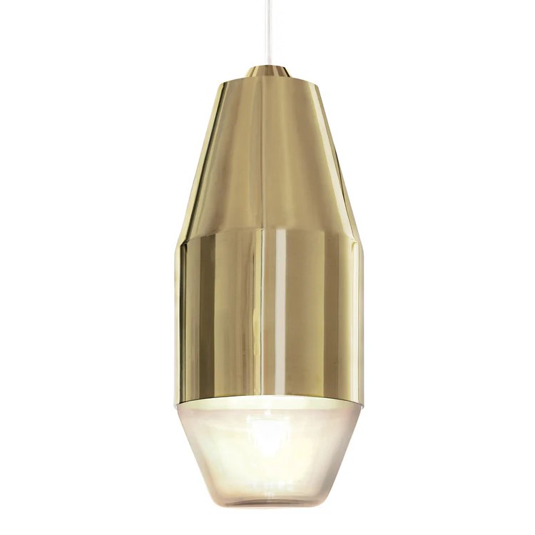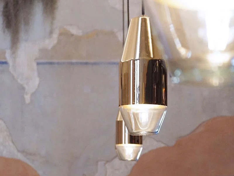Il corpo in ottone lucido della lampada riflette e cambia di continuo ciò che lo circonda, richiamando le dune che si disperdono all'infinito tutte diverse. La malia di miraggi e illusioni torna nelle rifrazioni del vetro, grezzo e materico.