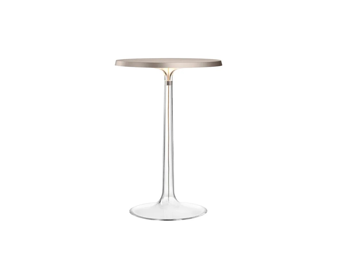 Designed by Philippe Starck, 2015. Lampada da tavolo a luce diffusa. Base e diffusore in PMMA trasparente stampato ad iniezione. Fonte luminosa con tecnologia Edge Lighting. Cavo elettrico lunghezza utile 200 cm, con interruttore dimmer che garantisce le funzioni ON/OFF e regolazione del flusso luminoso 10-100%. Power supply su spina con plug intercambiabili. Presente in diverse colorazioni e con diversi accessori.