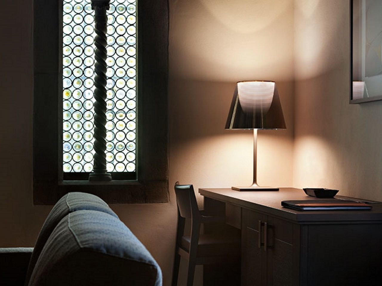 Designed by Philippe Starck, 2007. Lampada da tavolo a luce diffusa. Base, supporto asta e supporto diffusore in lega di Zama pressofusa lucidati. Asta in tubolare di alluminio lucidata. Copertura della base in PA (nylon) stampato di colore nero opaco ad iniezione. Diffusore interno in PC (policarbonato) stampato ad iniezione di colore opalino. Diffusore esterno in PMMA (polimetilmetacrilato) trasparente o fumée Rosone di colore bianco