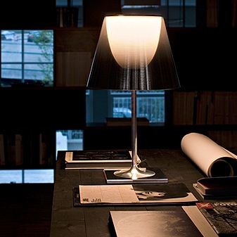 Designed by Philippe Starck, 2007. Lampada da tavolo a luce diffusa. Base, supporto asta e supporto diffusore in lega di Zama pressofusa lucidata e cromata. Copertura della base in PA (nylon) stampato di colore nero ad iniezione. Diffusore interno in PC (policarbonato) stampato ad iniezione di colore opalino. I diffusori esterni sono disponibili nelle versioni: trasparente o fumè realizzati in PMMA (polimetilmetacrilato), e metallizzato bronzo sulla superficie interna utilizzando un processo di alluminatura sottovuoto. Anello superiore in PC (policarbonato) stampato ad iniezione completamente trasparente o trasparente marrone per la versione con diffusore esterno metallizzato bronzo.