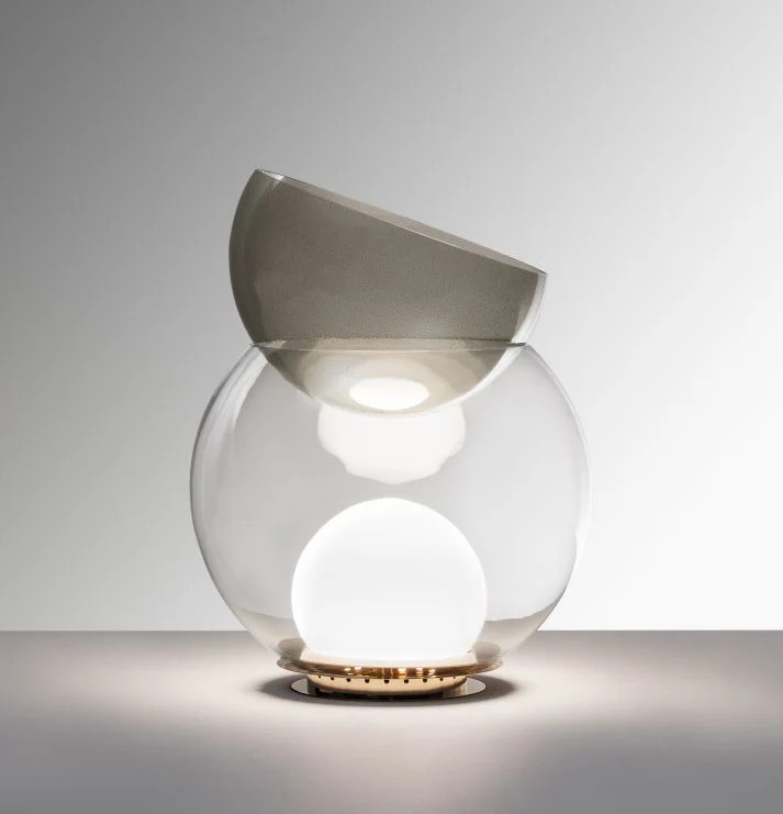 Ibrido tra un vaso e una lampada, Giova segna l’esordio di Gae Aulenti nel campo dell’illuminazione d’autore. Disponibile in due dimensioni, è una vera e propria scultura luminosa. Su una base in metallo è posizionato un globo trasparente che include la sfera interna, che alloggia la sorgente luminosa.