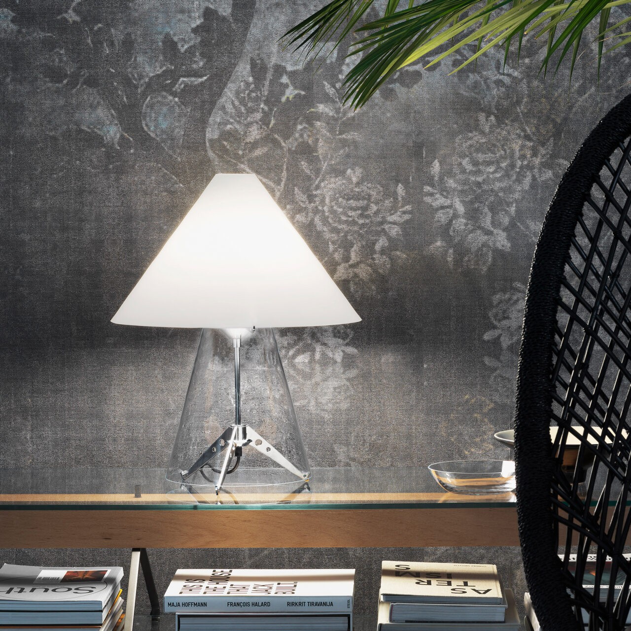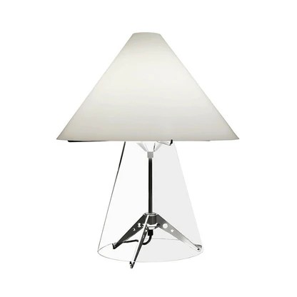 Una lampada da tavolo preziosa, composta da un diffusore conico a strati di vetro opalino, sorretto da una base in vetro trasparente che cela la struttura in metallo, tutta a incastro. Un oggetto di natura fortemente decorativa, prodotto con tecniche produttive tradizionali come la soffiatura a bocca del vetro.