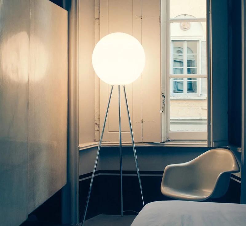 Un treppiede cromato la cui sommità inaspettatamente si infila all’interno di una preziosa sfera in vetro soffiato bianco. Linee essenziali, accostate in modo inedito, per un effetto d’insieme molto equilibrato.
