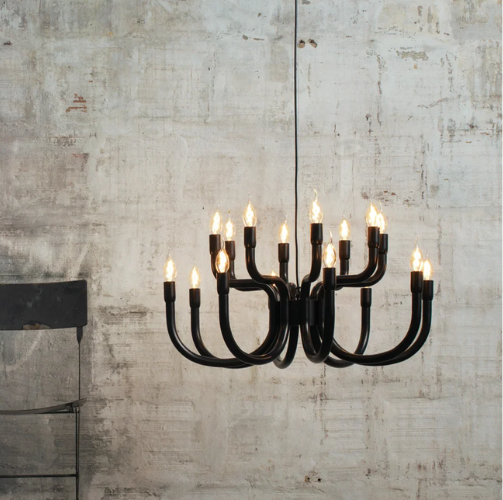Chandelier a dieci o sedici bracci in alluminio laccato che ripropone in chiave minimale ed estremamente contemporanea il design classico dei candelabri antichi.
