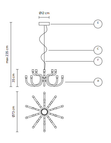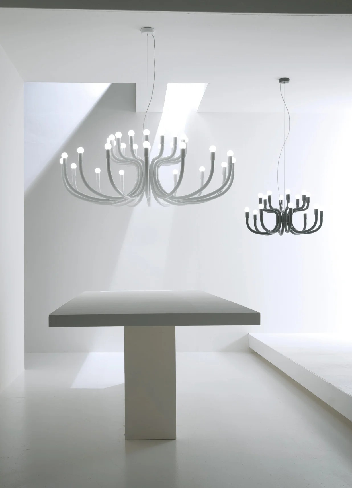 Chandelier a dieci o sedici bracci in alluminio laccato che ripropone in chiave minimale ed estremamente contemporanea il design classico dei candelabri antichi.