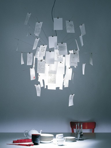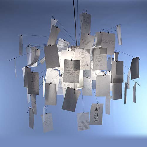 Lampada a sospensione composta da foglietti che invita l'utente a usare la propria creatività. I fogli possono essere disposti a piacere. I fogli bianchi in dotazione possono essere usati per schizzi o messaggi personali.