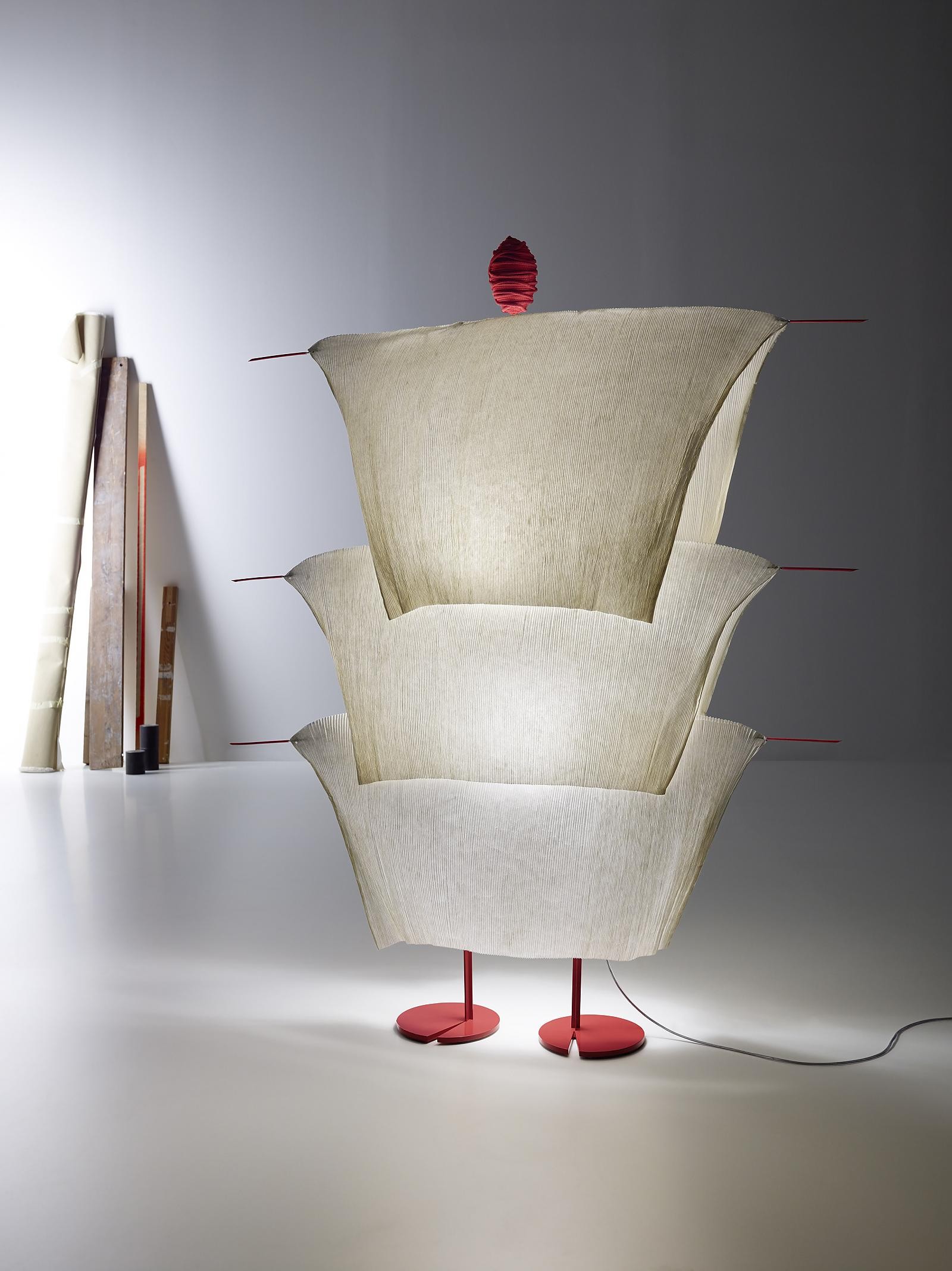 "Walking In The Rain" è un grande oggetto luminoso scultoreo. Si erge nella stanza come una figura, poggiando su due piedi rossi. Tre fogli di carta sovrapposti ricordano un mantello.