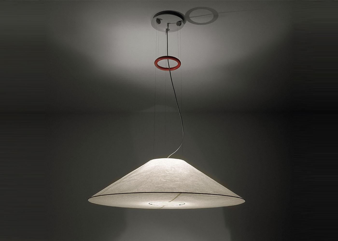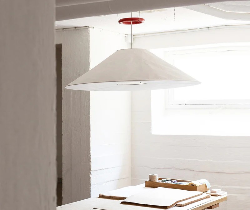 Maru, la lampada a sospensione, traduce in luce la poesia della carta giapponese. La visione del designer si esprime in un volume circolare sospeso, leggerissimo, attraversato dalla purezza di linee essenziali e impreziosito dall’iconico anello rosso in ferro, elemento funzionale e distintivo che aggiunge carattere.