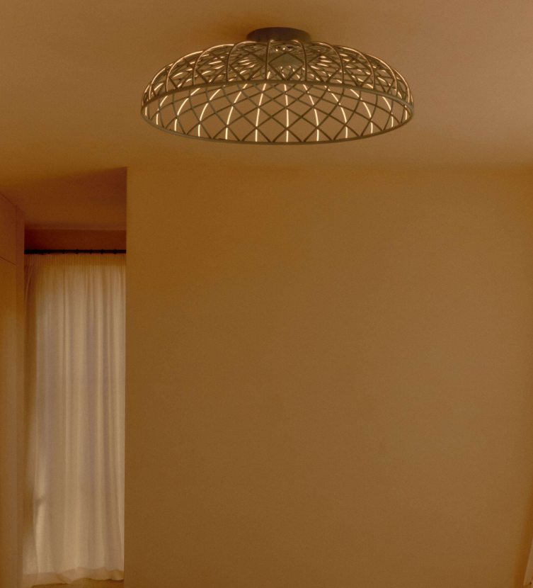 Apparecchio a plafone a luce diffusa. La cupola è una combinazione di elementi ciechi e luminosi disposti a rete, e composti da anime rivestite da una sottile maglia tubolare colorata intrecciata in tessuto riciclato e riciclabile derivato dal Poliestere. Ogni singolo elemento luminoso si alimenta grazie a speciali micro connettori presenti nella parte superiore della cupola, ed è rivestito da una maglia bicolore, con il lato orientato verso linterno della cupola sempre bianco, così da permettere un'ottimale emissione luminosa del modulo led.